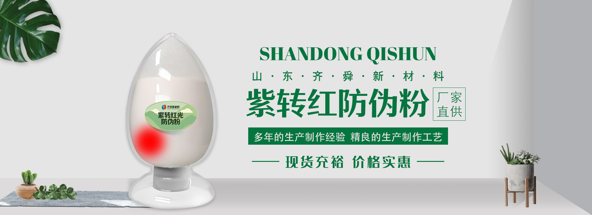 我公司前身為2011年成立的淄博舜明熒光科技有限公司。隨著公司的發(fā)展,廠址從淄博搬遷到青島,2020年5月公司重新注冊(cè)為山東齊舜新材料有限公司。公司注冊(cè)資本2000萬(wàn)元,主要從事新材料研究和開(kāi)發(fā)。目前主要產(chǎn)品包括:農(nóng)膜用轉(zhuǎn)光粉、轉(zhuǎn)光母粒以及轉(zhuǎn)光農(nóng)膜;農(nóng)膜用長(zhǎng)效防霧流滴涂覆液;復(fù)合肥添加劑及葉面肥(稀土微肥);防偽粉;LED封裝熒光粉;夜光粉;太陽(yáng)能光伏電池增效熒光粉;鋰電池正極材料等。